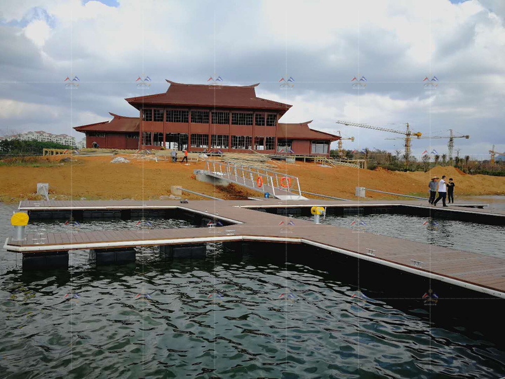 This dock was built in Baisha Lake,Hainan province,it can berth a 40 feet boat,4 pest of jet ski boats and 11 speed boats.The fixing system is steel supporting bar+concrete block.