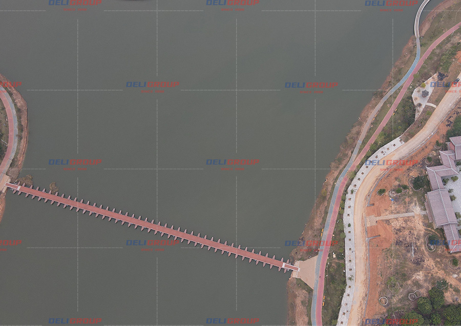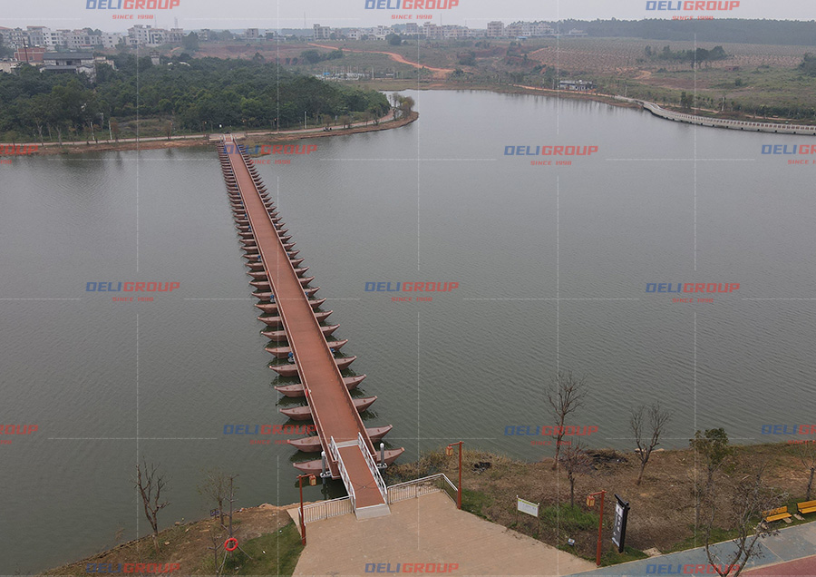 The Zhanjiang antique floating bridge has a total length of about 200 meters and a width of 3 meters. In order to match the color of the ancient buildings on the shore, the overall antique floating bridge also uses an imitation wood color scheme. Aluminum alloy protective railings are installed on both sides of the antique floating bridge to meet landscape and safety requirements. The floating body of the antique floating bridge is connected by dozens of antique boats, and the bridge is mainly fixed by underwater anchoring devices. The antique floating bridge spans across the lake, connecting the two banks. The bridge deck is equipped with lighting effects, making it a beautiful scenic spot in the local area.